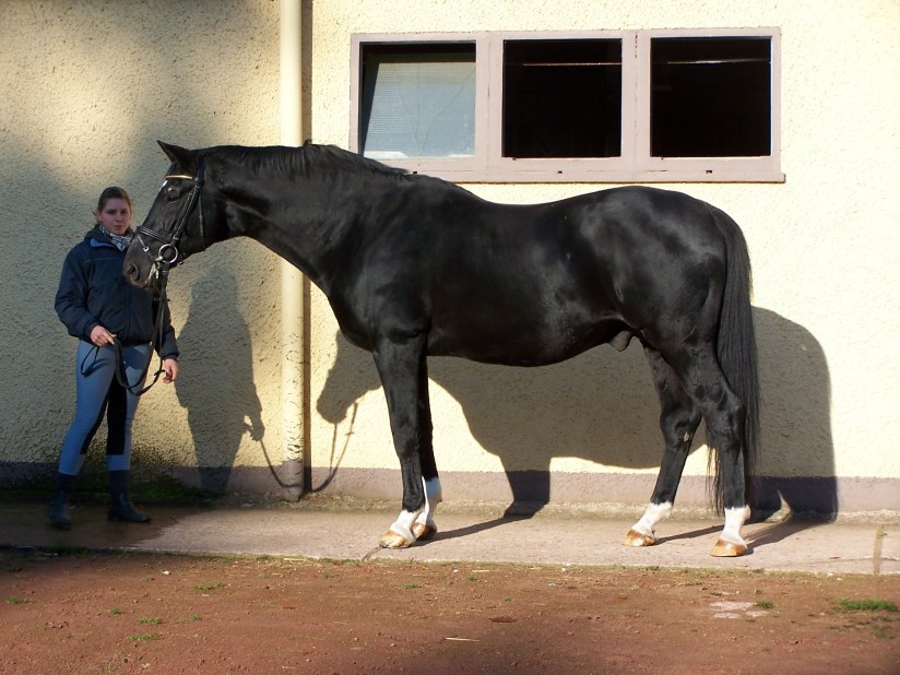 On to Horem Stud. An interesting experience!! The stud is run by Mr Hubertus Poll and his family he is indeed a character. Again, inside for refreshments. This stud has some very successful horses under its belt………….obviously, you have all heard of Imperio??? The stallions here at the moment are Buddenbrock, Connery, Songline, Kaiserdom, and Imperio. Mr Poll told us he had minimal horses around because they had all headed to Neumunster. Not quite right as we found out!!!! He talked to us about his thoughts on the future of the breed of Trakehners and his future with his stud. He talked about some of the decisions he had made in the past and the consequences of his decisions, both good and bad. He spoke also about the fact that he runs his stud to make a profit, which is in contrast to many of the other studs we had seen which he felt had lots of outside money to contribute. He said his focus is on marketing the horses he produces and feels the most important things are movement movement movement and of course temperament which he suggested is why so many people still use Buddenbrock because his progeny is stamped with his impeccable temperament. We saw Imperio’s magnificent win at the Bundeschampionate on DVD. We then went for a walk outside through the facilities. Whilst wandering, we came across a big black horse tied up…………….Buddenbrock!!!!! In the stables none other than Connery and Imperio!!!! No horses home, yeah right!!! What stood out to me with all three of them as they were happy to be patted, touched etc….. I even had a big cuddle with Buddenbrock and indeed loved him. He certainly made a good impression on me, he is apparently very rideable as well, oh and the pedigrees although I’m sure many of you would already know, Buddenbrock by Sixtus out of Ballerina by Diamant. Connery by Buddenbrock out of Caro-Dame II by Karo AS and Imperio by Connery out of Isar VI by Balfour XX. I must say all of these three impressed me with not only looks and movement but their temperament was very good. When Imperio was awarded his Bundeschampion apparently the other awarded horses went a bit crazy from the crowd’s noise as we have all seen before, but he just stood there and looked around, not fussed at all. This visit was certainly different from the others, informative but different. Off to the motel, sleep, and Neumunster!!